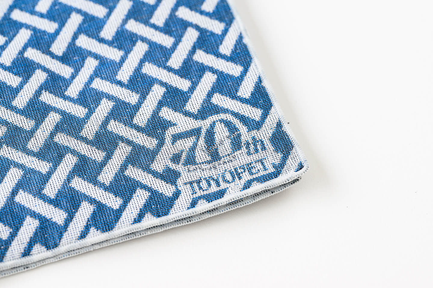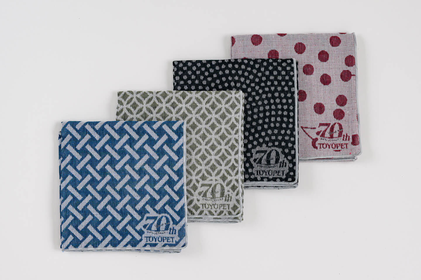 米織小紋は江戸時代から受け継がれてきた伝統ある織物で、その柄は縁起の良い「吉祥紋」を中心に展開されています。トヨペットをご愛顧いただいているお客様の多幸を願い、また70周年への感謝の気持ちを込めて、周年記念ロゴをあしらった米織小紋のハンカチを、お誕生日という特別な節目をお祝いする贈り物として、日頃の感謝をお伝えいたします。